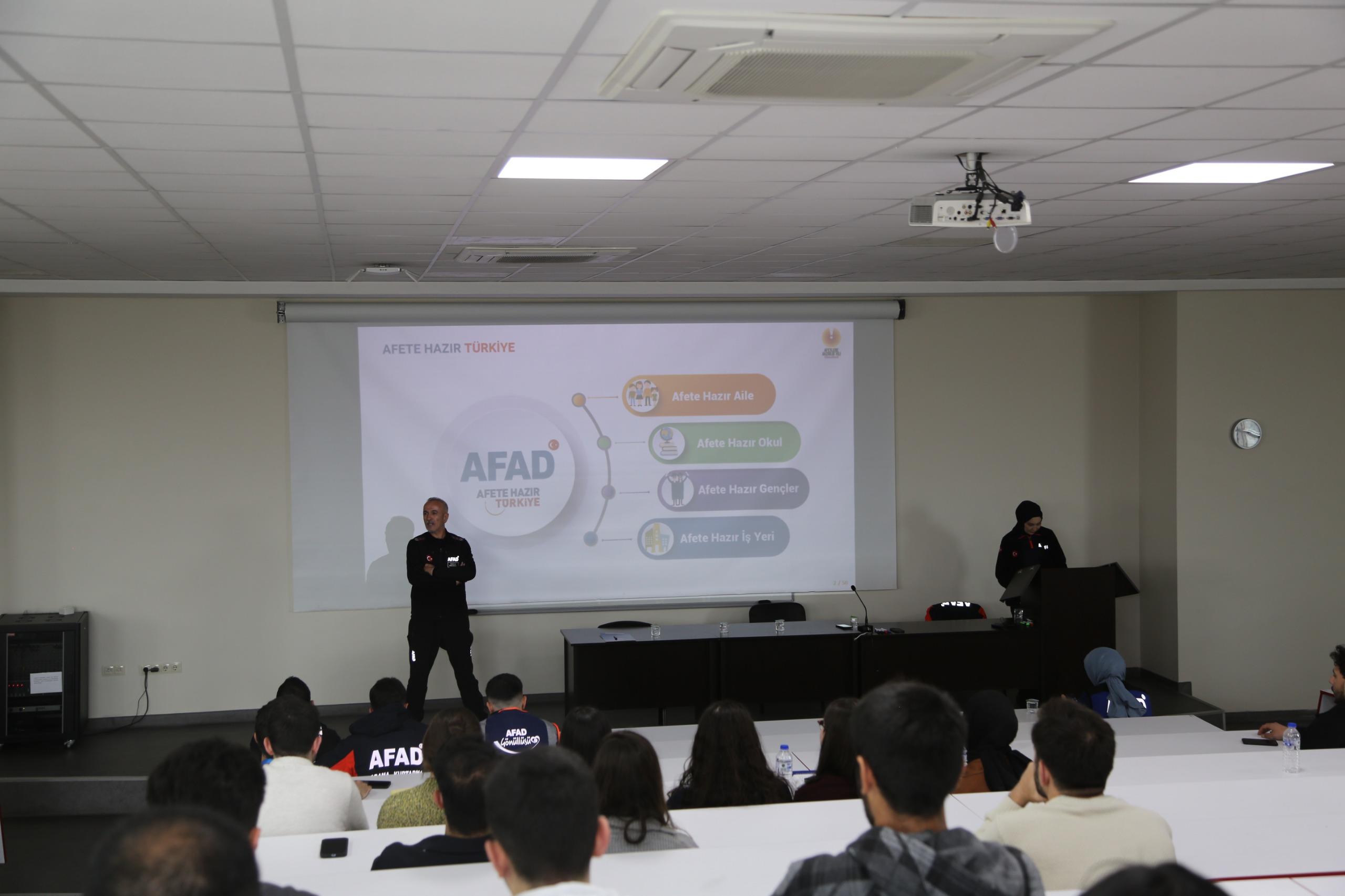 Hukuk Fakültesi Amfi 3’de gerçekleştirilen etkinliğe, AFAD Arama Kurtarma Birlik Müdürü Hasan Say, AFAD personeli Arzu Aktaş ve öğrenciler katıldı.