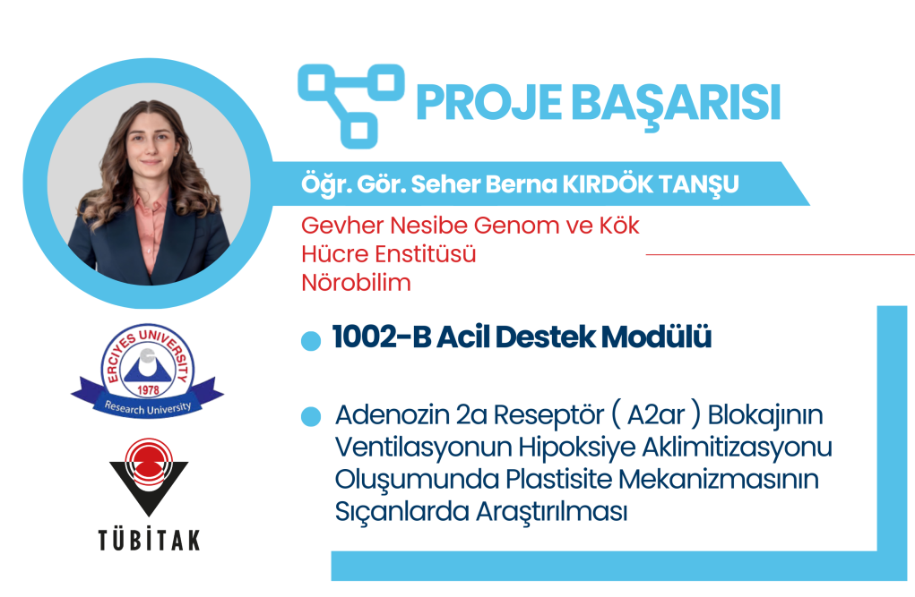 Üniversitemiz Gevher Nesibe Genom ve Kök Hücre Enstitüsü Nörobilim Ana Bilim Dalı doktora öğrencisi Öğr. Gör. Seher Berna KIRDÖK TANŞU'nun yürütücü ve Tıp Fakültesinden Dr. Öğr. Üyesi Kemal Erdem BAŞARAN'ın danışman olduğu "Adenozin 2a Reseptör ( A2ar ) Blokajının Ventilasyonun Hipoksiye Aklimitizasyonu Oluşumunda Plastisite Mekanizmasının Sıçanlarda Araştırılması" başlıklı proje TÜBİTAK 1002-B Hızlı Destek Modülü kapsamında desteklenmeye hak kazanmıştır.