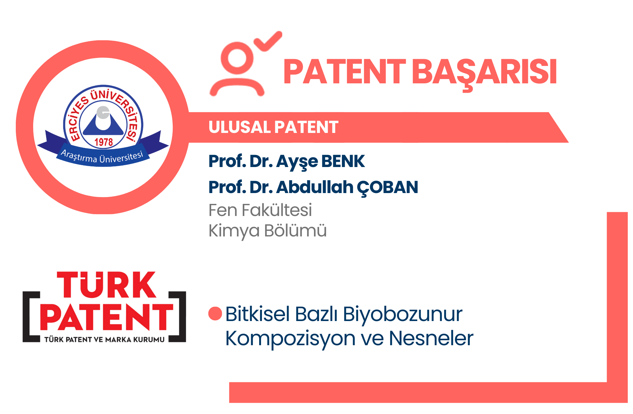 Üniversitemiz Fen Fakültesi Kimya Bölümü öğretim üyeleri Prof. Dr. Ayşe BENK ve Prof. Dr. Abdullah ÇOBAN tarafından geliştirilen "Bitkisel Bazlı Biyobozunur Kompozisyon ve Nesneler" başlıklı ulusal patent Türk Patent ve Marka Kurumu tarafından tescil edilmiştir.