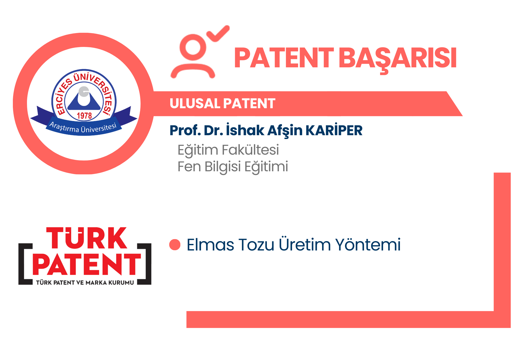 Üniversitemiz Eğitim Fakültesi Fen Bilgisi Eğitimi öğretim üyesi Prof. Dr. İshak Afşin KARİPER tarafından geliştirilen "Elmas Tozu Üretim Yöntemi" başlıklı ulusal patent Türk Patent ve Marka Kurumu tarafından tescil edilmiştir.