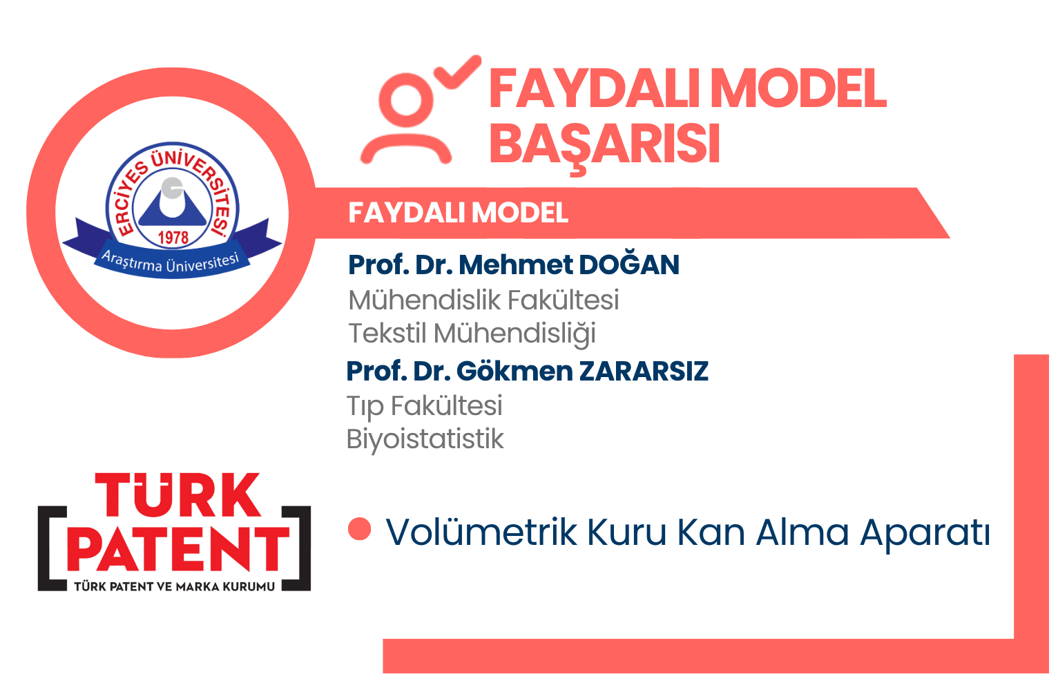 Üniversitemiz Mühendislik Fakültesi Tekstil Mühendisliği Bölümü öğretim üyesi Prof. Dr. Mehmet DOĞAN ve Tıp Fakültesi Biyoistatistik Bölümü öğretim üyesi Prof. Dr. Gökmen ZARARSIZ tarafından geliştirilen "Volümetrik Kuru Kan Alma Aparatı” başlıklı faydalı model Türk Patent ve Marka Kurumu tarafından tescil edilmiştir.