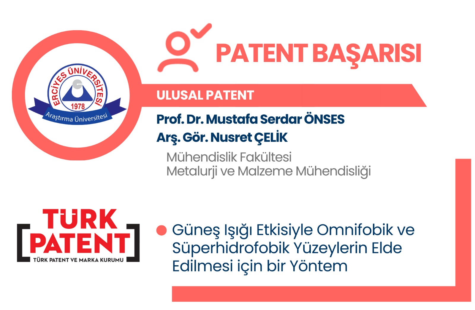 Üniversitemiz Mühendislik Fakültesi Metalurji ve Malzeme Mühendisliği Bölümü öğretim elemanlarından Prof. Dr. Mustafa Serdar ÖNSES ve Arş. Gör. Nusret ÇELİK tarafından geliştirilen "Güneş Işığı Etkisiyle Omnifobik ve Süperhidrofobik Yüzeylerin Elde Edilmesi için Bir Yöntem" başlıklı ulusal patent Türk Patent ve Marka Kurumu tarafından tescil edilmiştir.