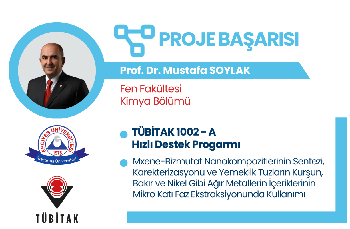 ERÜ Fen Fakültesi Kimya Bölümü öğretim üyesi Prof. Dr. Mustafa SOYLAK'ın yürütücü, Çankırı Karatekin Üniversitesi'nden Dr. Ögr. Üyesi Zeliha ERBAŞ ve Ege Üniversitesi'nden Doç. Dr. Zinar Pınar GÜMÜŞ'ün arastırmacı olduğu “Mxene-Bizmutat Nanokompozitlerinin Sentezi, Karekterizasyonu ve Yemeklik Tuzların Kurşun, Bakır ve Nikel Gibi Ağır Metallerin İçeriklerinin Mikro Katı Faz Ekstraksiyonunda Kullanımı” başlıklı proje, TÜBİTAK 1002-A Hızlı Destek Modülü kapsamında TÜBİTAK tarafından desteklenmeye hak kazanmıştır.