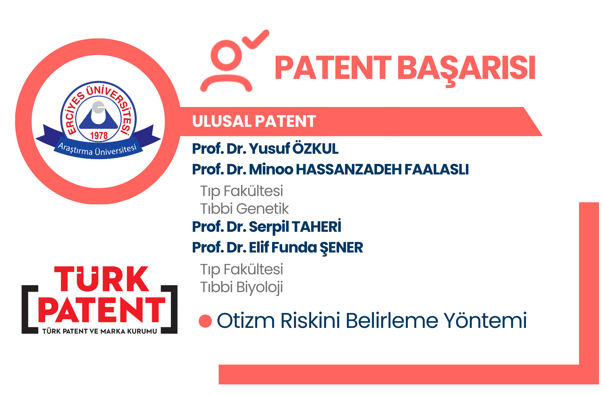 Üniversitemiz Tıp Fakültesi Tıbbi Genetik öğretim üyeleri Prof. Dr. Yusuf ÖZKUL ve Prof. Dr. Minoo HASSANZADEH FAALASLI, Tıp Fakültesi Tıbbi Biyoloji öğretim üyeleri Prof. Dr. Serpil TAHERİ ve Prof. Dr. Elif Funda ŞENER tarafından geliştirilen "Otizm Riskini Belirleme Yöntemi" başlıklı ulusal patent Türk Patent ve Marka Kurumu tarafından tescil edilmiştir.