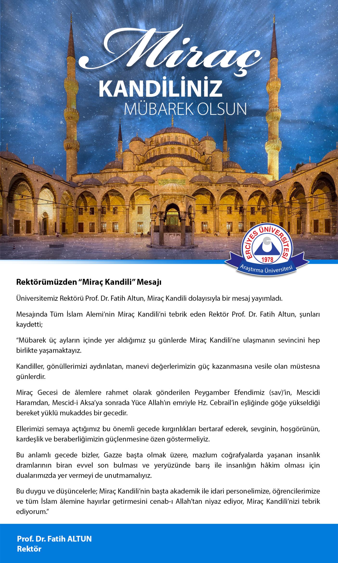 Rektörümüz Prof. Dr. Fatih ALTUN'un Miraç Kandili Mesajı