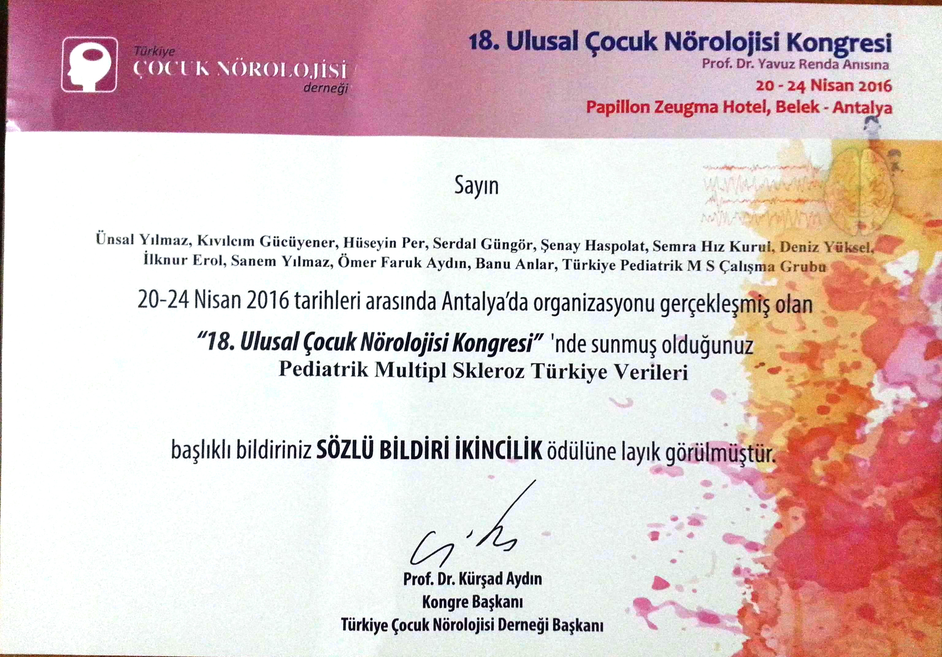 20-24 Nisan 2016 tarihleri arasında Antalya’da düzenlenen 18. Ulusal Çocuk Nörolojisi Kongresi’nde Ünsal Yılmaz, Kıvılcım Gücüyener, Hüseyin Per, Serdal Güngör, Şenay Haspolat, Semra Hız Kurul, Deniz Yüksel, İlknur Erol, Sanem Yılmaz, Ömer Faruk Aydın, Banu Anlar, Türkiye Pediatrik MS Çalışma Grubu “Pediatrik Multipl Skleroz Türkiye Verileri” başlıklı bildirileri ile “Sözlü Bildiri İkincilik” ödülüne layık görülmüşlerdir.