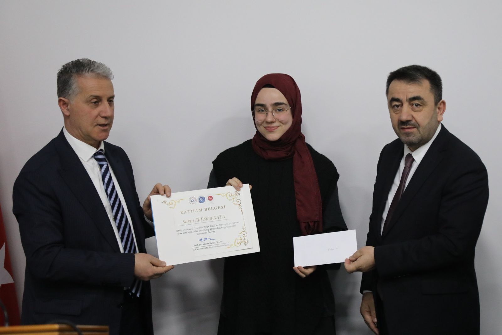 Yarışma sonunda dereceye giren öğrencilere hediyeleri İl Müftüsü Durmuş Ayvaz ve İlahiyat Fakültesi Dekanı Prof. Dr. Ahmet Kamil Cihan tarafından takdim Cihan tarafından takdim edildi.