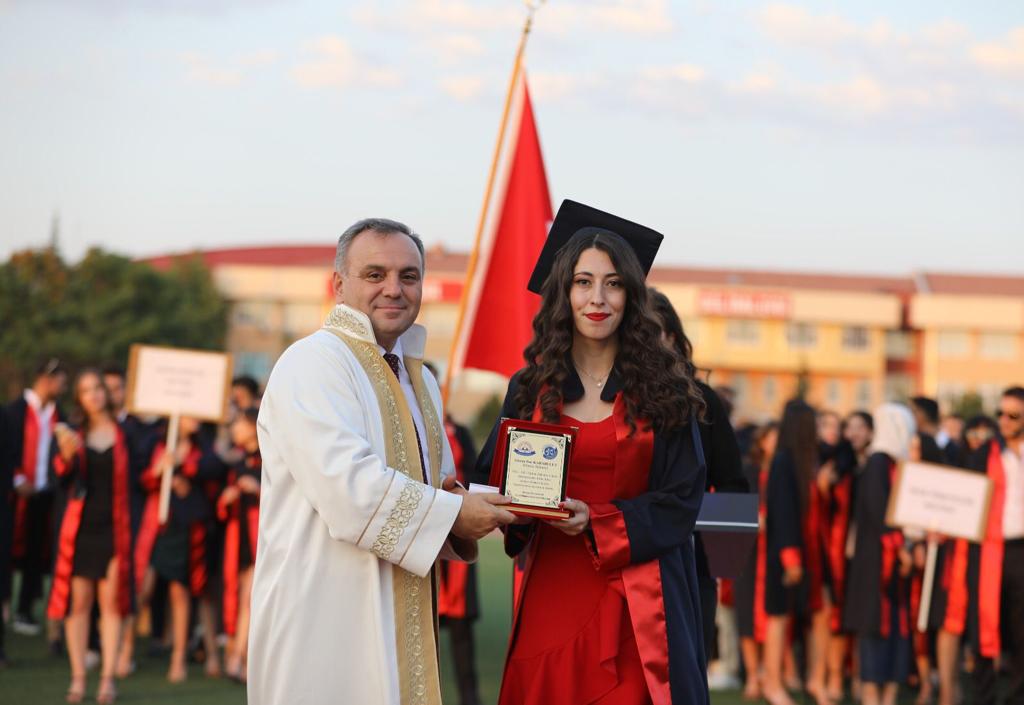 Spor Bilimleri Fakültesi mezunu yamaç paraşütü sporcularının Ali Dağı yamaç paraşütü alanından tören alanına inmesinin ardından 2022-2023 eğitim-öğretim yılı dönem birincisi Gizem Nur Karabulut, mezuniyet kütüğüne plaket çaktı.