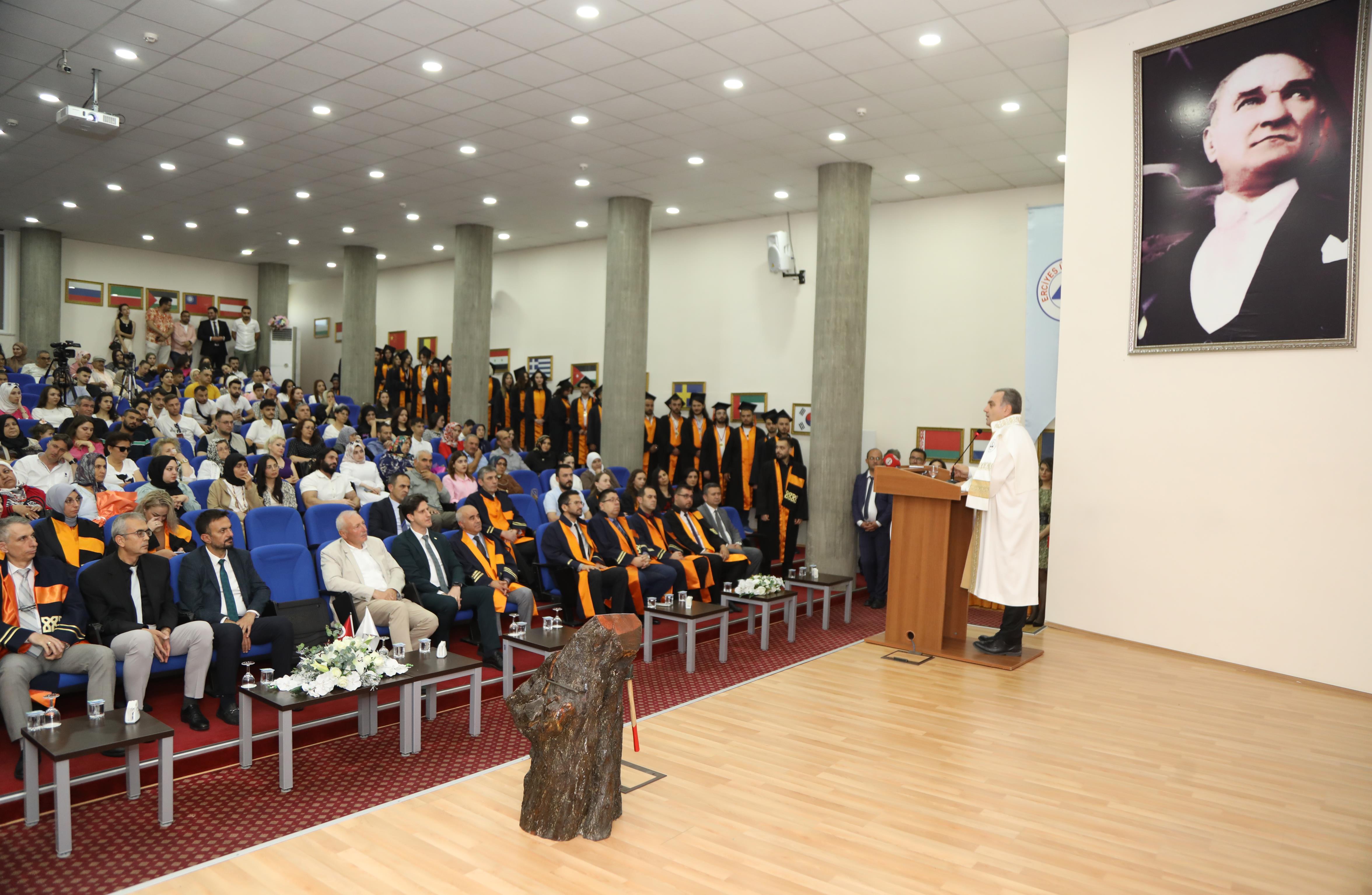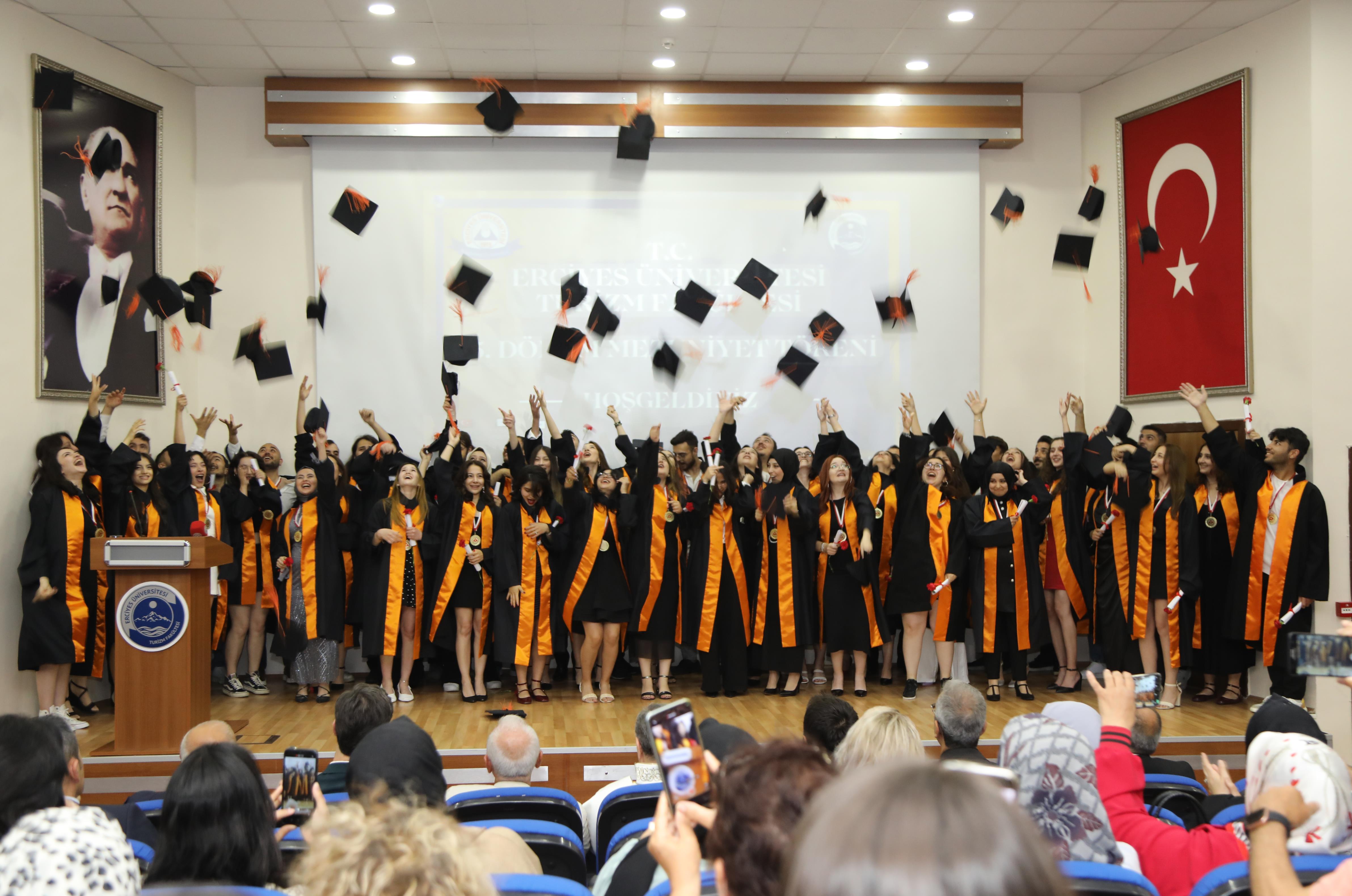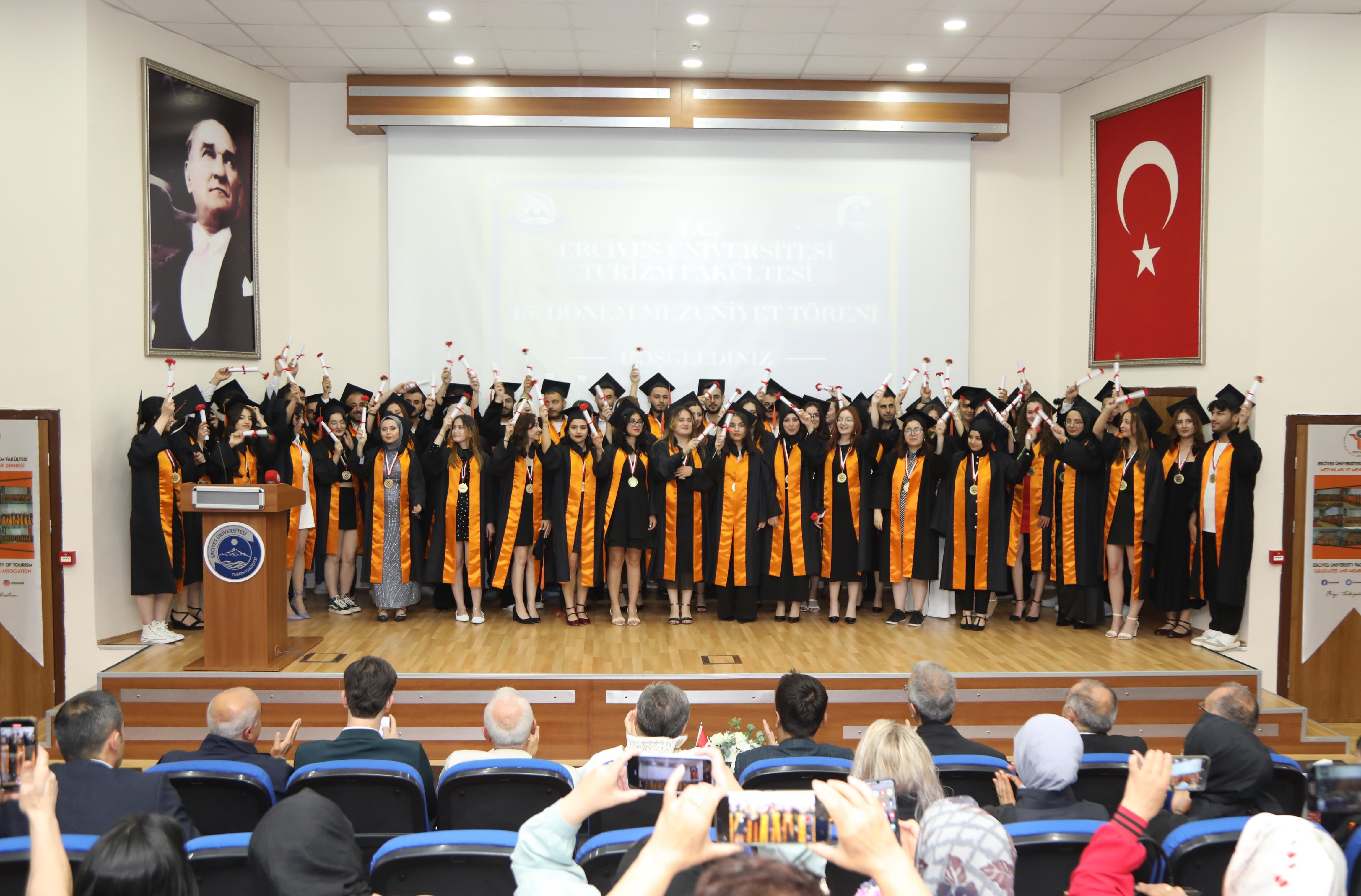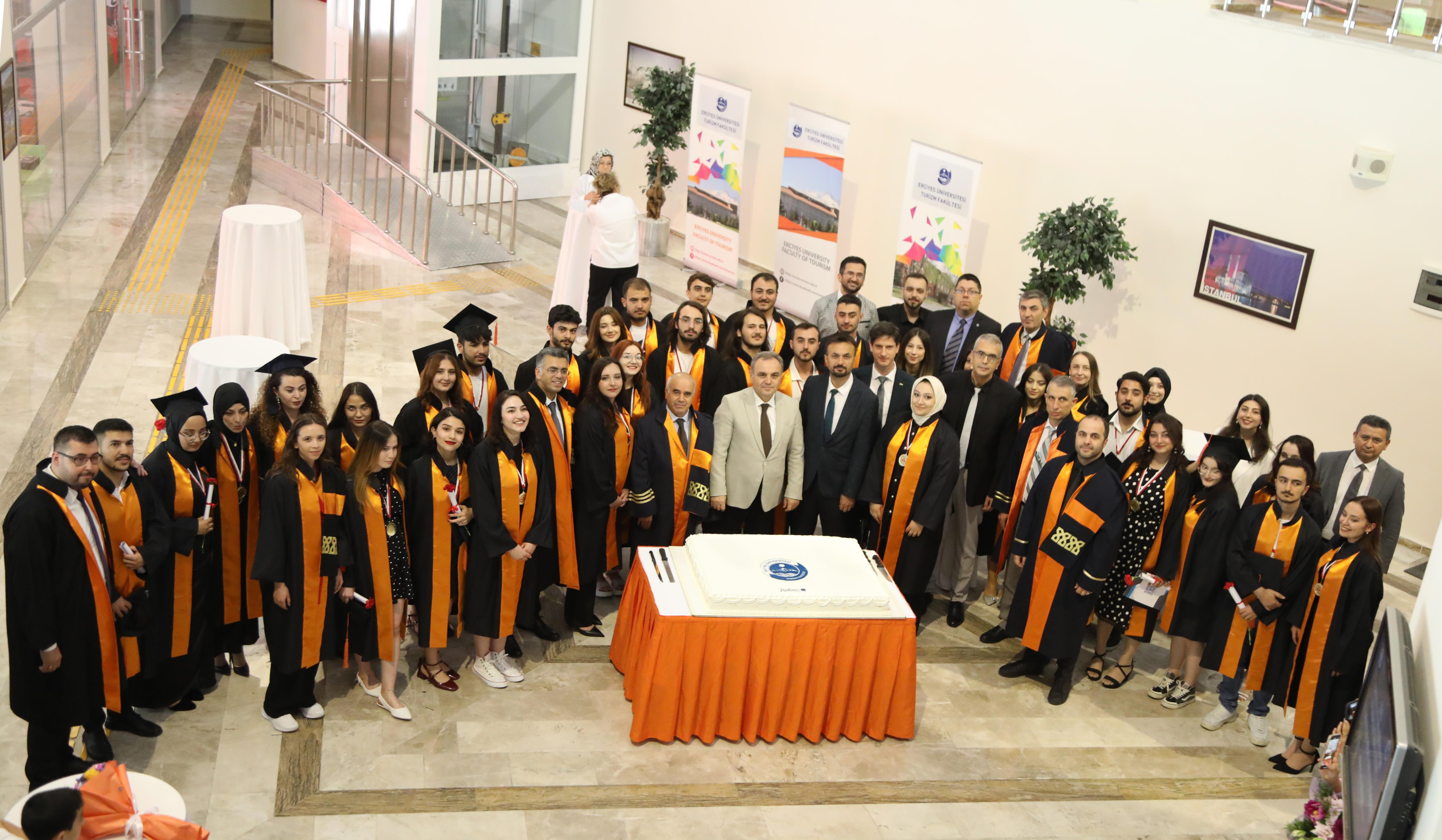 Turizm Fakültesi Konferans Salonunda gerçekleştirilen mezuniyet törenine; Rektör Prof. Dr. Fatih Altun, Turizm Fakültesi Dekanı Prof. Dr. Kenan Güllü, Eczacılık Fakültesi Dekanı Prof. Dr. Orhan Püsküllü, İl Kültür ve Turizm Müdürü Dr. Şükrü Dursun, Kayseri Büyükşehir Belediyesi Genel Sekreter Yardımcıları Ali Hasdal ve Mustafa Türkmen ile akademisyenler, öğrenciler ve aileler katıldı.