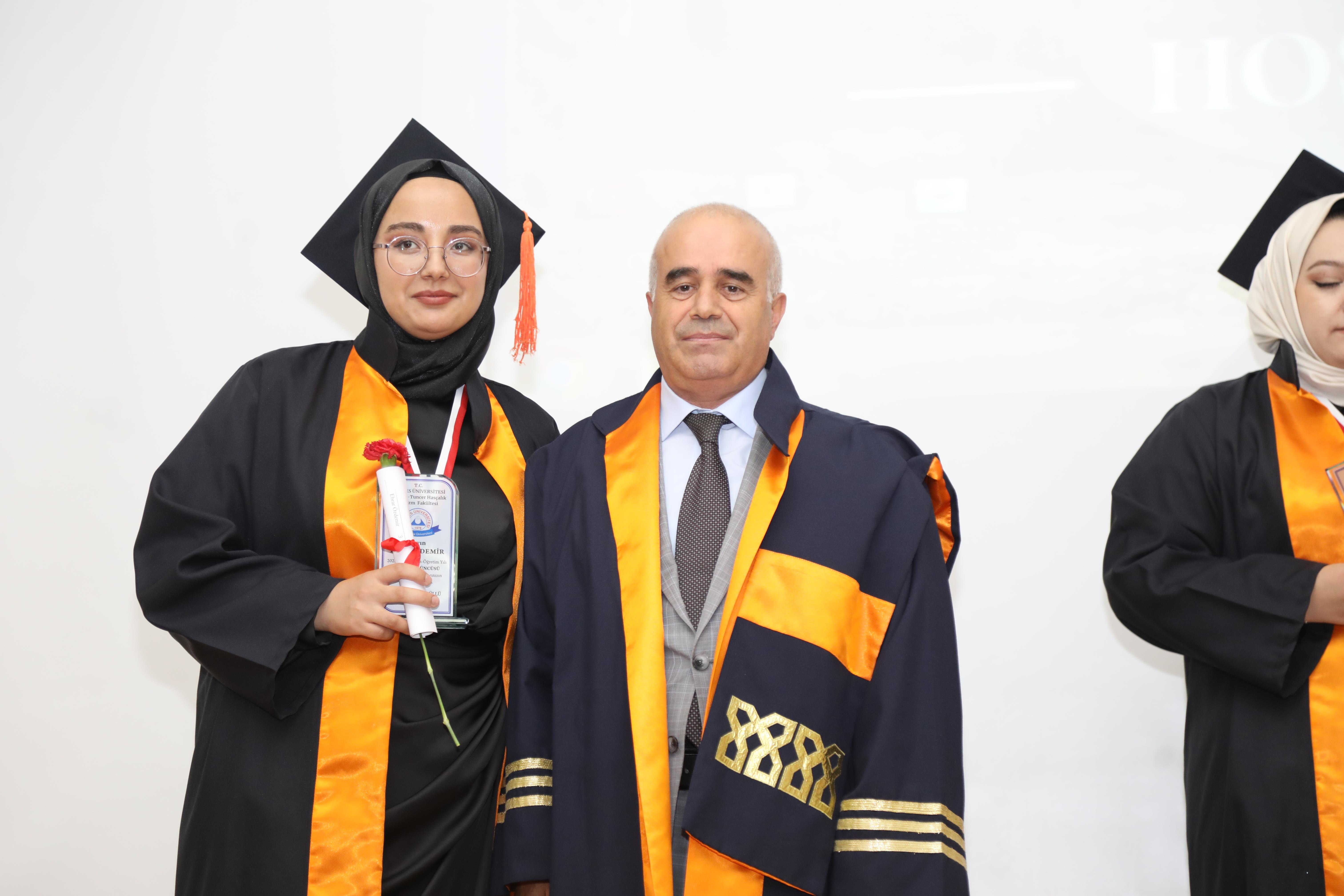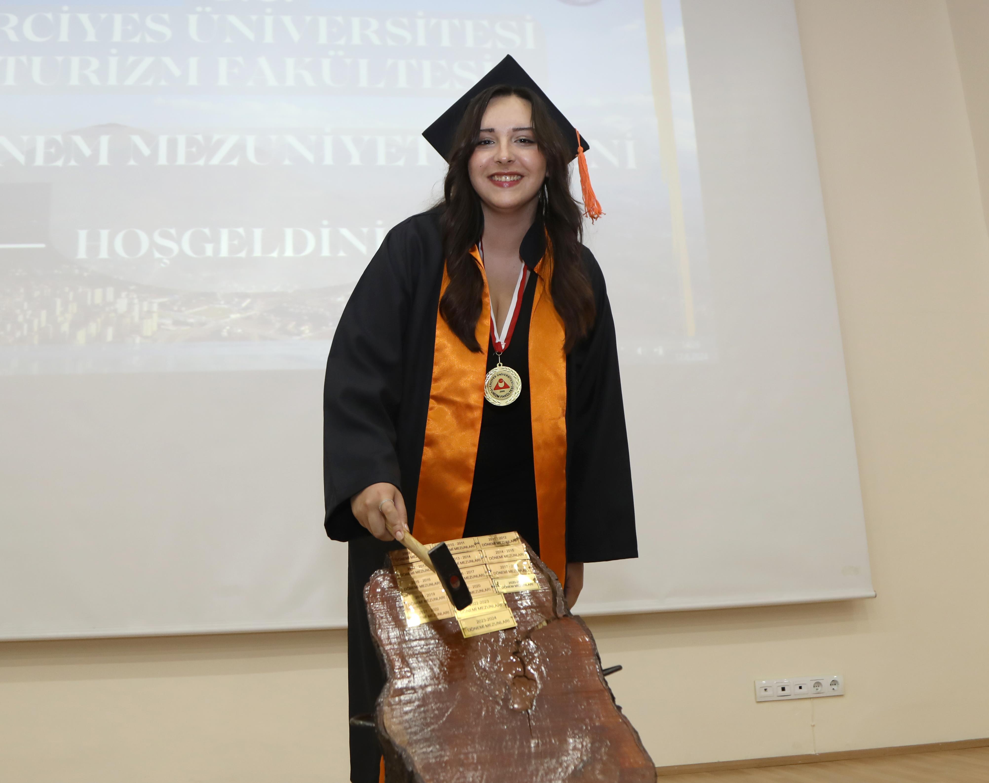 Konuşmaların ardından fakülte Birincisi Turizm Rehberliği Bölümü Öğrencisi Ayşe Nur Kılıç, mezuniyet kütüğüne plaket çaktı.