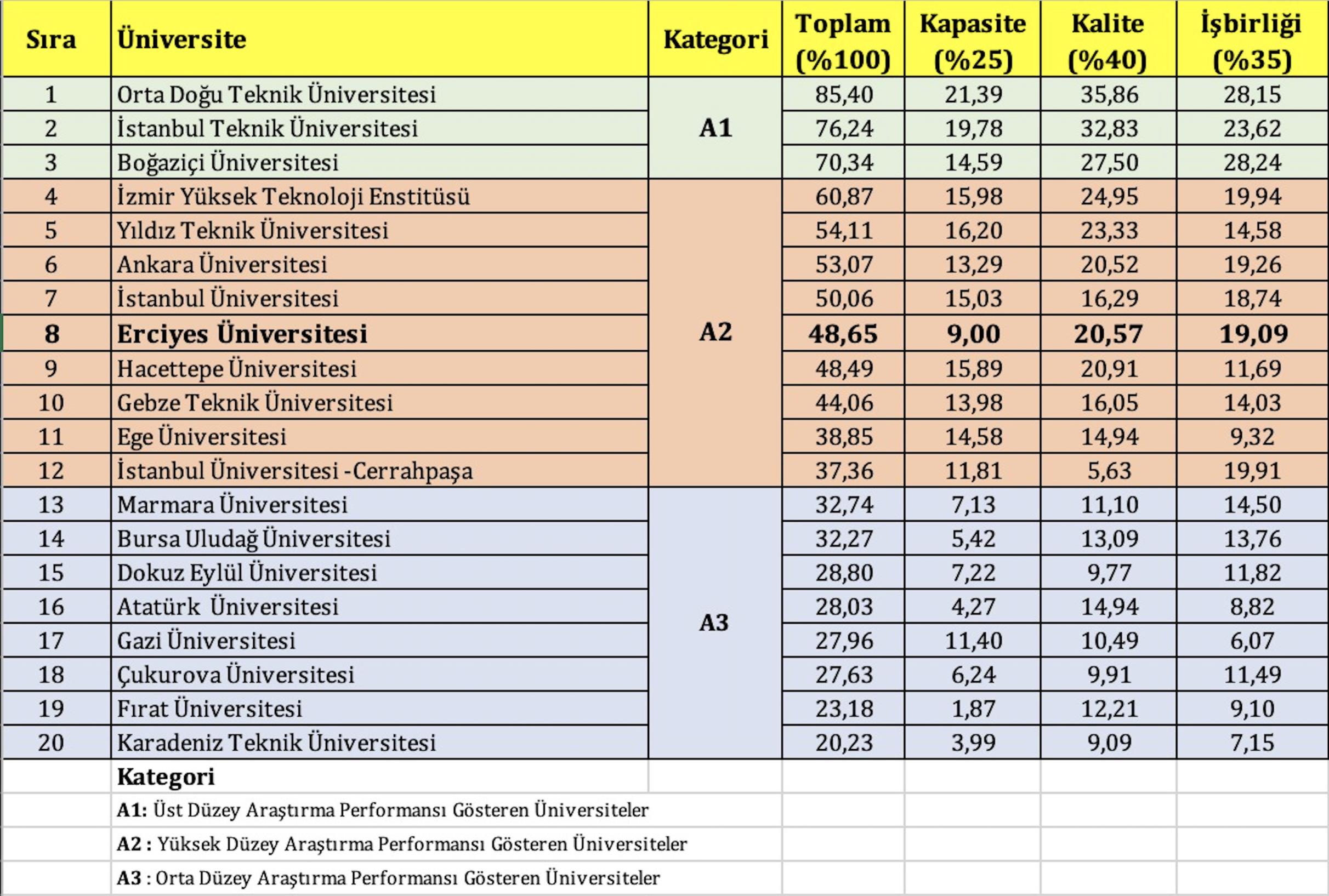 Yeniden Türkiye’nin araştırma üniversiteleri arasında yer almaktan gurur duyduklarını belirten Rektör Çalış, “43 yıllık köklü mazisi ile Üniversitemizin yeniden ülkemizin araştırma üniversiteleri arasında yer almasının gururunu yaşamaktayız. Daha önce 11 olarak belirlenen araştırma üniversitesi sayısı bu yıl 20 devlet 3 vakıf üniversitesi olmak üzere 23’e çıkarılmıştır. Bu kapsamda Üniversitemiz yüksek düzey araştırma üniversitesi performansı gösteren üniversiteler kategorisine girmiş ve geçen yıllara oranla başarı sırasını yükselterek, 48.65 puan ile 8’inci sırada yer alarak, yeniden ülkemizin araştırma üniversitelerinden birisi olmuştur. Bizler Erciyes Üniversitemizin başarısı çıtasını yükseltmeye devam edeceğiz. Yeniden Araştırma Üniversitesi olarak seçilmemizde emeği geçen akademik ve idari personelimiz ile tüm öğrencilerimize teşekkür ederiz” dedi.
