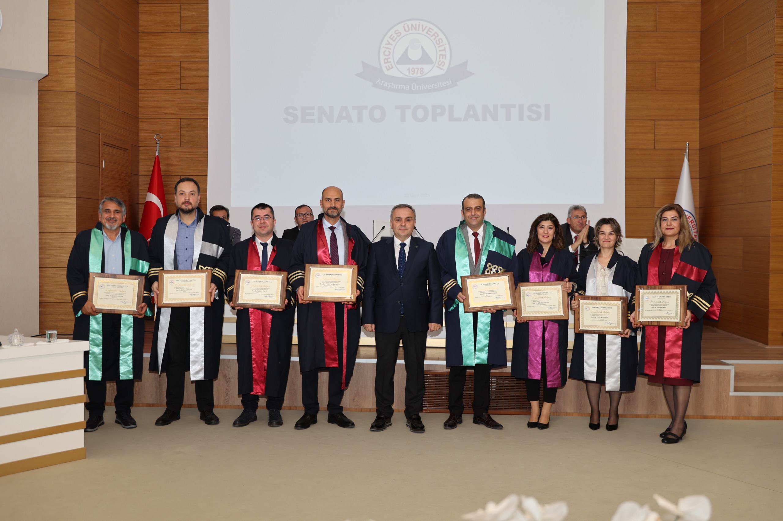 Üniversitemiz Senato Salonu’nda gerçekleşen törende; atamaları yapılan 8 öğretim üyemize, Fakülte Dekanları tarafından “Profesörlük Belgesi” verilirken, Rektörümüz Prof. Dr. Fatih Altun tarafından da cübbeleri giydirildi.