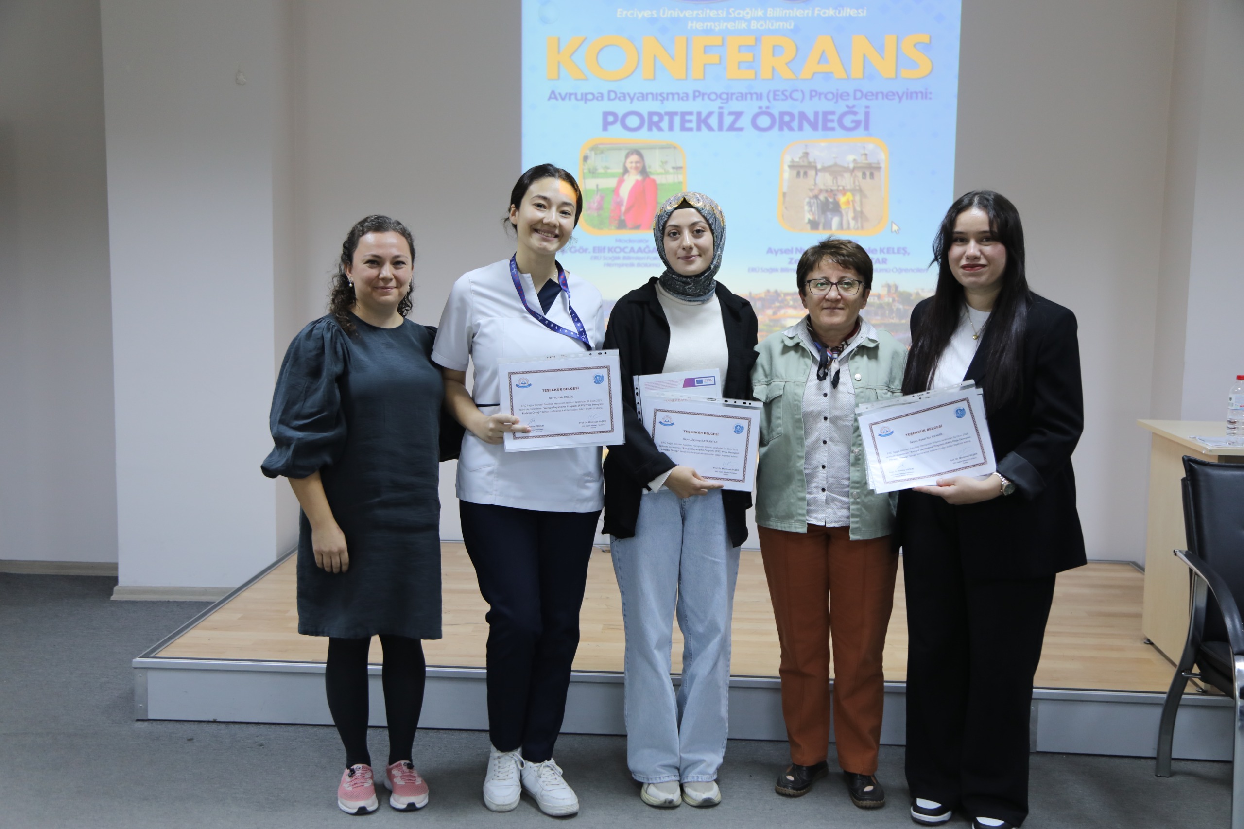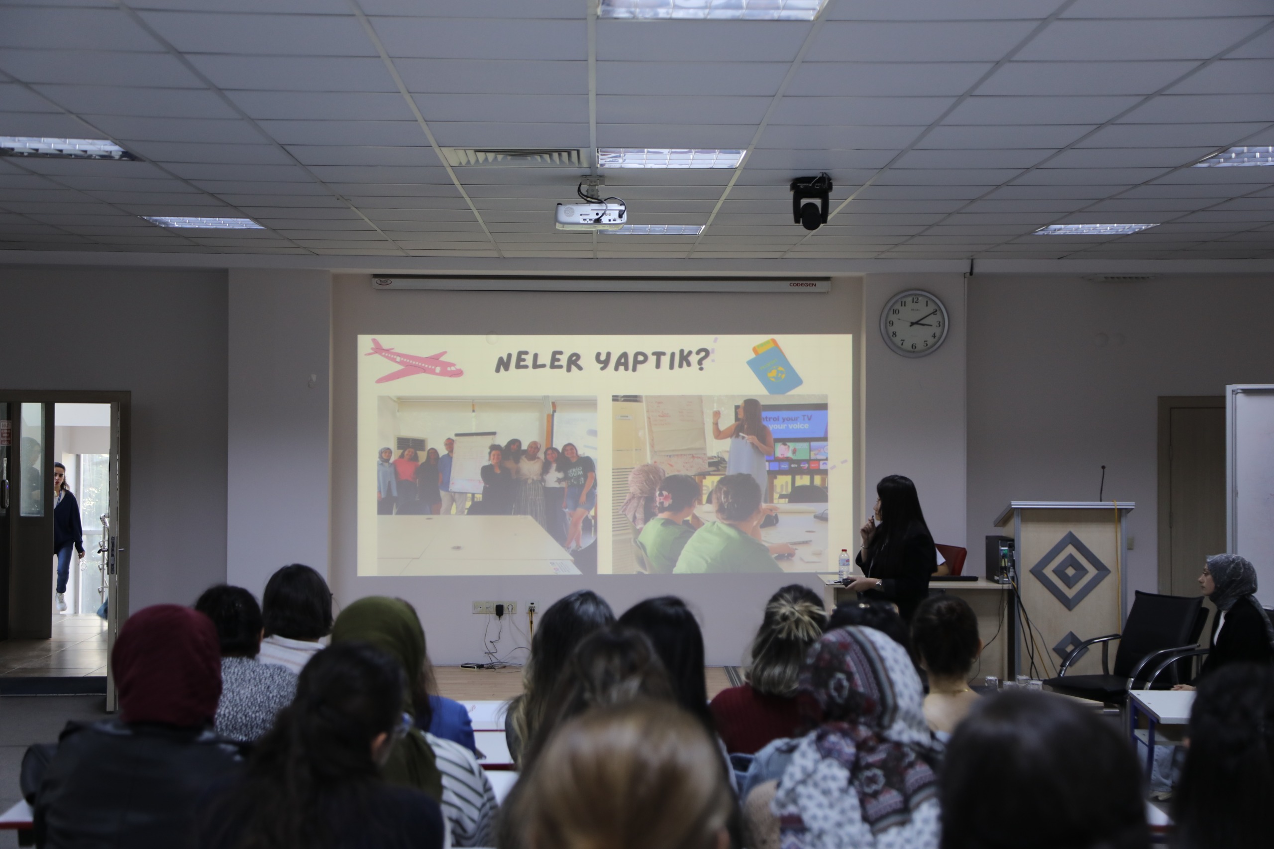 Konferansta konuşan Üniversitemiz Sağlık Bilimleri Fakültesi Hemşirelik Bölümü öğrencileri Aysel Nur Kendir, Hale Keleş, Zeynep Bayraktar, Avrupa Birliği destekli ESC programının gençler için sunduğu fırsatlar hakkında katılımcılara bilgi verdiler.