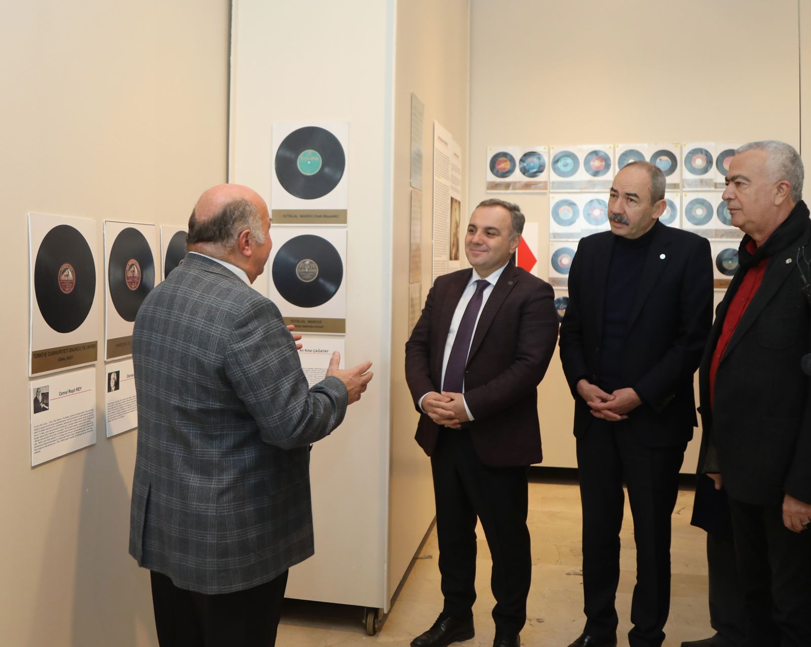Sergide, 8 adet Cumhuriyet dönemi öncesi olmak üzere 49 taş plak ve 82 adet 45’lik ve 1 adet 33’lük plak sergilendi.