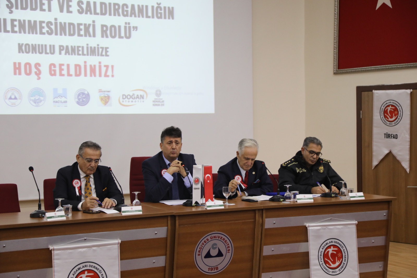 Turizm Fakültesi’nde gerçekleştirilen panele; Hacılar Belediye Başkanı Bilal Özdoğan, Kayseri Gazeteciler Cemiyeti Başkanı Metin Kösedağ, Türkiye Futbol Adamları Derneği Kurucu Başkanı ve Kayseri Şube Başkanı Şükrü Sağlam, Kayseri İl Emniyet Müdür Yardımcısı Çevik Kuvvet Şube Müdürü Yasin Zeki, Spor Bilimleri Fakültesi Dekanı Prof. Dr. Mustafa Kaya, akademisyenler ve öğrenciler katıldı.
