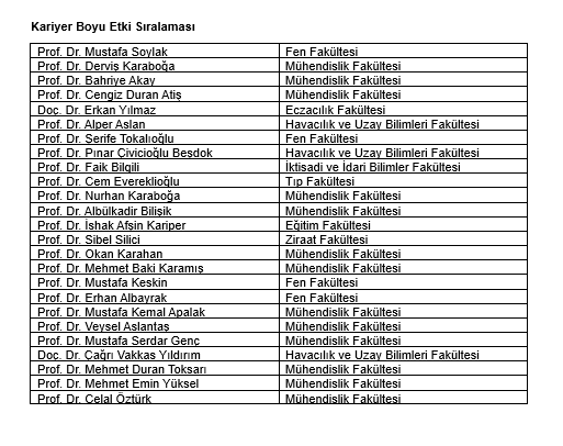2024 yılı sonuçlarına göre Üniversitemizden Kariyer Boyu Etki Sıralamasında toplam 26 bilim insanı listede yer aldı. Analitik Kimya kategorisinde 3, Yapay Zekâ ve Görüntü İşleme kategorisinde 8, Yapı ve İnşaat kategorisinde 2, Tasarım Uygulamaları ve Yönetimi kategorisinde 1, Enerji kategorisinde 2, Çevre Bilimleri kategorisinde 1, Akışkanlar ve Plazmalar kategorisinde 1, Gıda Bilimi kategorisinde 1, Genel Fizik kategorisinde 1, Malzeme Bilimi kategorisinde 2, Makine Mühendisliği ve Ulaşım kategorisinde 2, Göz Hastalıkları ve Optometri kategorisinde 1, Polimer Bilimi kategorisinde 1 akademisyen yer alırken; alanlarına göre dünyada ilk 100'de 2, ilk 500'de 4, ilk 1000'de 10 akademisyen listelendi.
