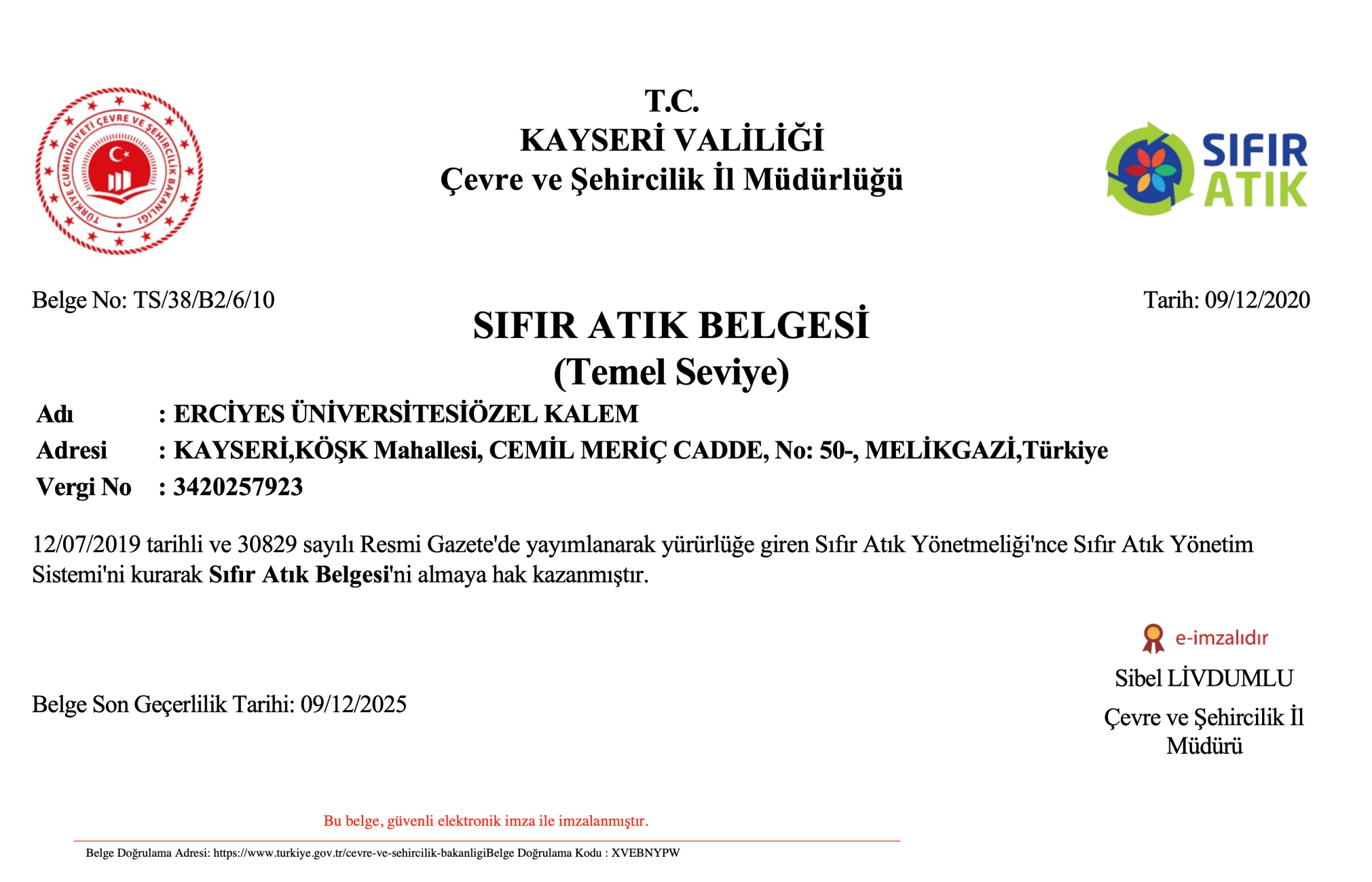 Sayın Emine Erdoğan’ın himayelerinde, Çevre ve Şehircilik Bakanlığı tarafından 12/07/2019 tarihli ve 30829 sayılı Resmi Gazete’de yayımlanarak yürürlüğe giren Sıfır Atık Yönetmeliği’nce yürütülen çalışmalar ile Üniversitemize Çevre ve Şehircilik İl Müdürlüğü tarafından “Sıfır Atık Belgesi” verildi.