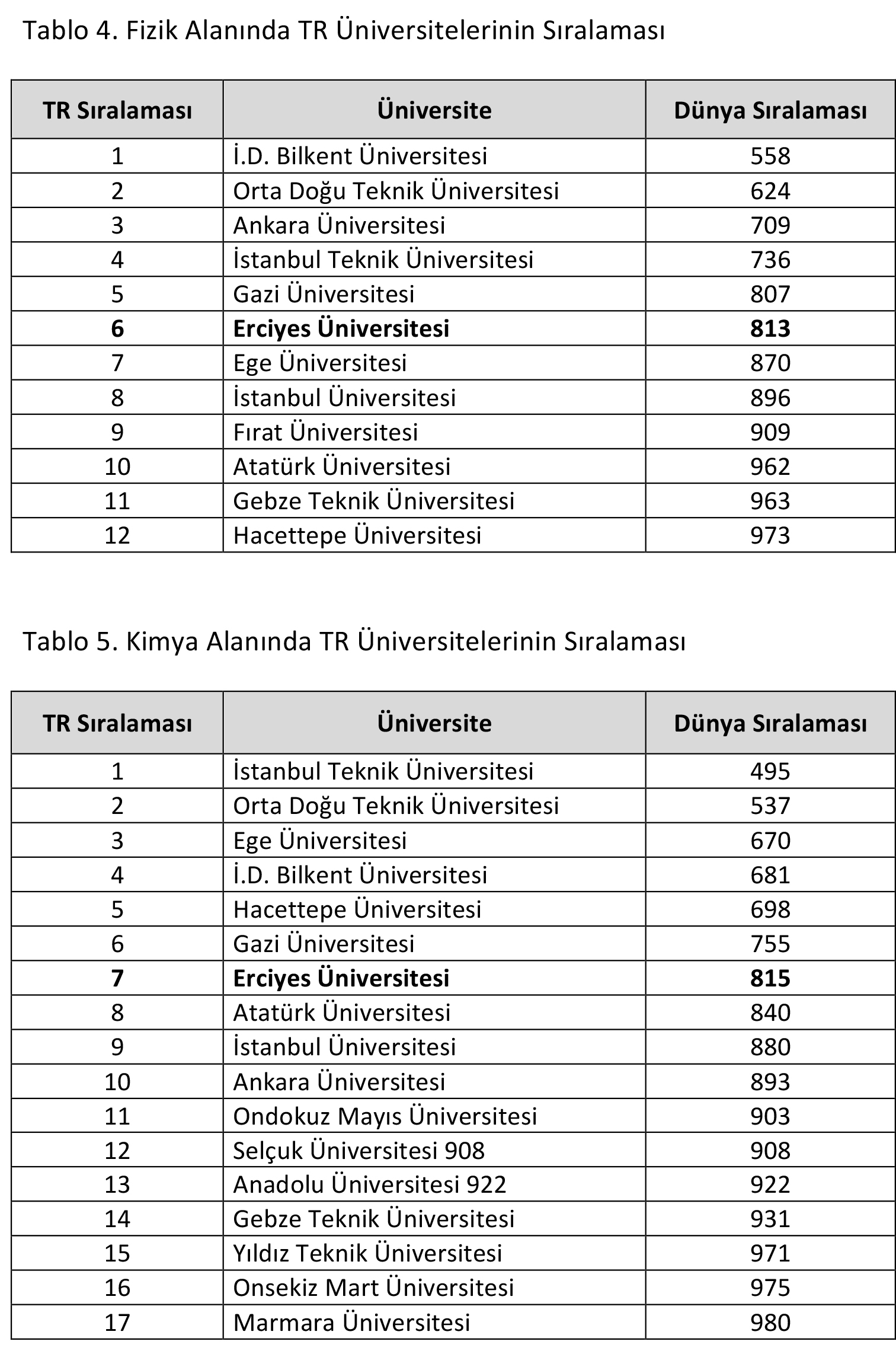 Erciyes Üniversitesi’nin yer aldığı alanlar ve Türkiye Üniversiteleri arasındaki sıralaması ise Tablo 1-Tablo 5’de verilmiştir.