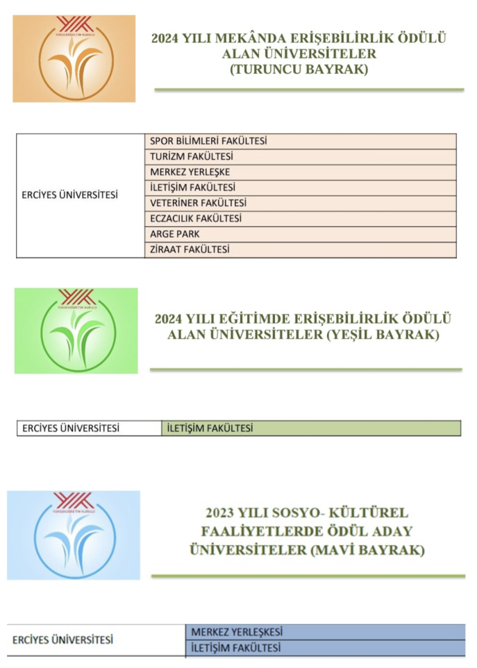 İletişim ve Kampüste Sosyal Kültürel Faaliyetlerde Erişim alanında ise 2 adet mavi bayrak ödülüne Erciyes Üniversitesi aday oldu.