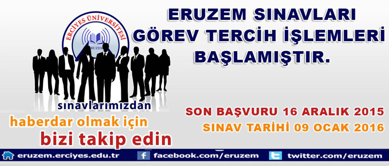 Erciyes Üniversitesi Uzaktan Eğitim Uygulama ve Araştırma Merkezi (ERUZEM) tarafından 09 Ocak 2016 Cumartesi günü 2 (iki) oturumda merkezi olarak yapılacak sınavlarda ücret karşılığı görev almak isteyen Akademik ve İdari personellerimizin 16 Aralık 2015 mesai bitimine kadar eruzem.erciyes.edu.tr adresindeki görevli işlemleri sistemi üzerinden ivedilikle tercihlerini yapmaları gerekmektedir.