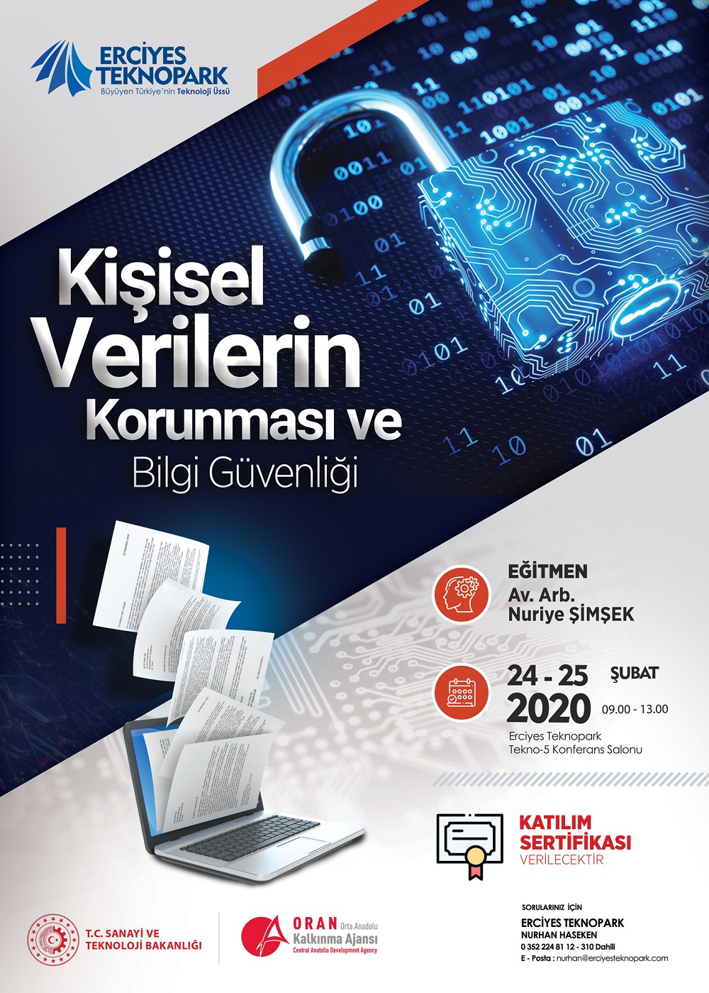 Erciyes Teknopark ve ORAN Kalkınma Ajansı iş birliği ile sizler için "Kişisel Verilerin Korunması ve Bilgi Güvenliği Eğitimi” düzenlenecektir.