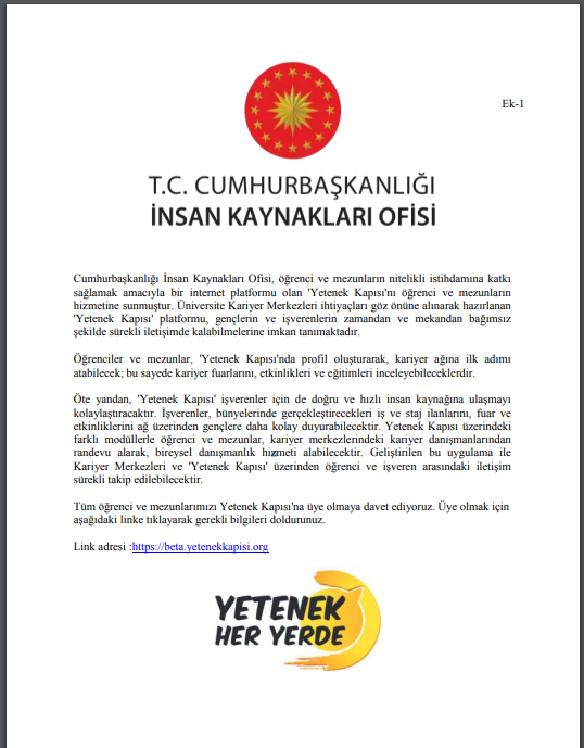 Cumhurbaşkanlığı İnsan Kaynakları Ofisi, öğrenci ve mezunların nitelikli istihdamına katkı sağlamak amacıyla bir internet platformu olan 'Yetenek Kapısı'nı öğrenci ve mezunların hizmetine sunmuştur. Link adresi için tıklayınız