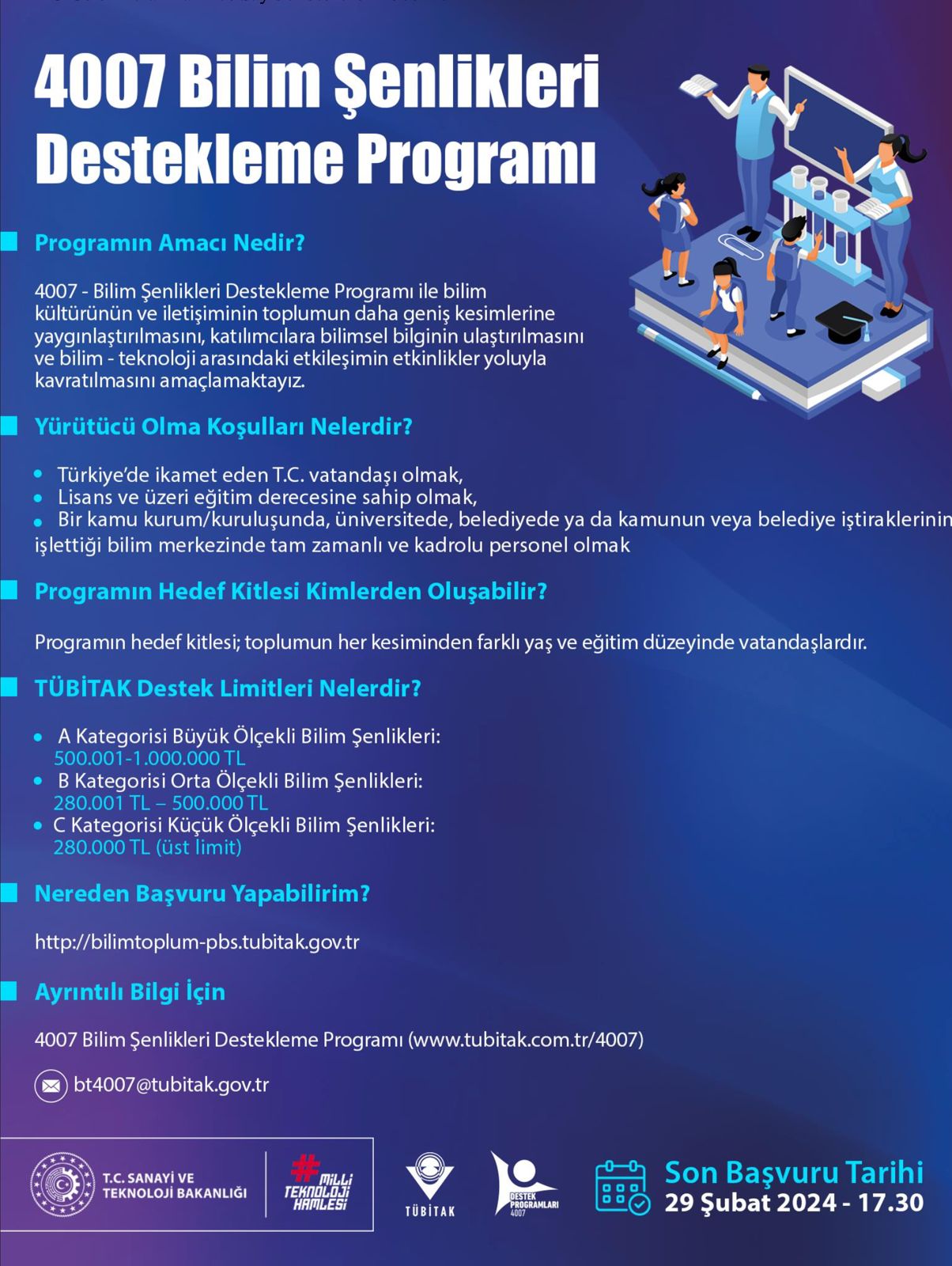 9. çağrısı yayınlanan 4007 Bilim Şenlikleri Destekleme Programına başvurular 22 Ocak 2024 itibariyle Bilim ve Toplum Proje Başvuru Sistemi üzerinden alınacaktır.