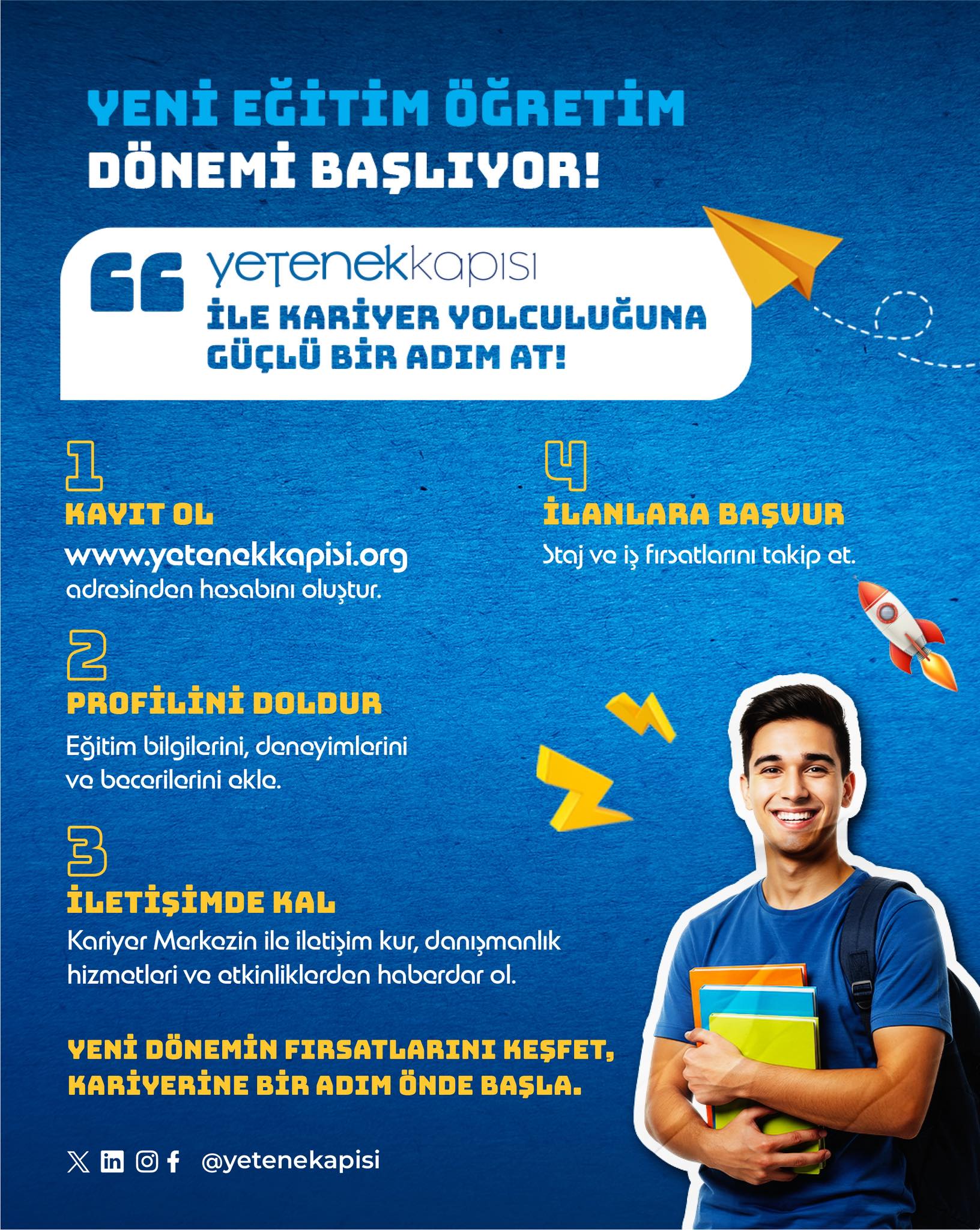 Değerli öğrencimiz, mezunumuz; Yetenek Kapısı ile kariyer etkinliklerinden haberdar olabilir, danışmanlık hizmetinden faydalanabilir, iş/staj ilanlarını takip edebilirsin. Profilini oluşturmaya hemen başla.