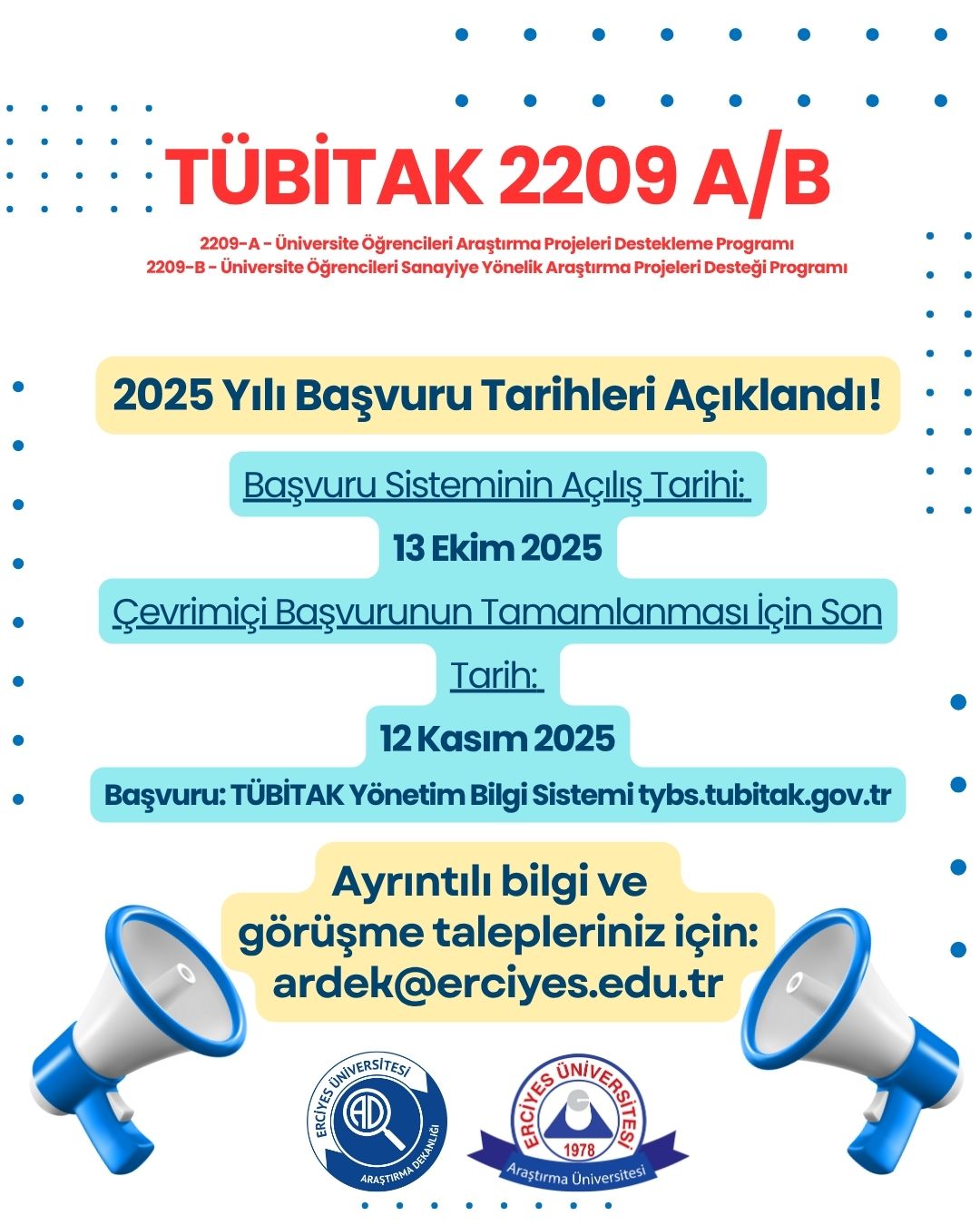Erciyes Üniversitesi olarak tüm ön lisans ve lisans öğrencilerimizi, proje fikirleriyle birlikte Araştırma Dekanlığı’na başvurmaya ve bu önemli fırsattan yararlanmaya davet ediyoruz.
