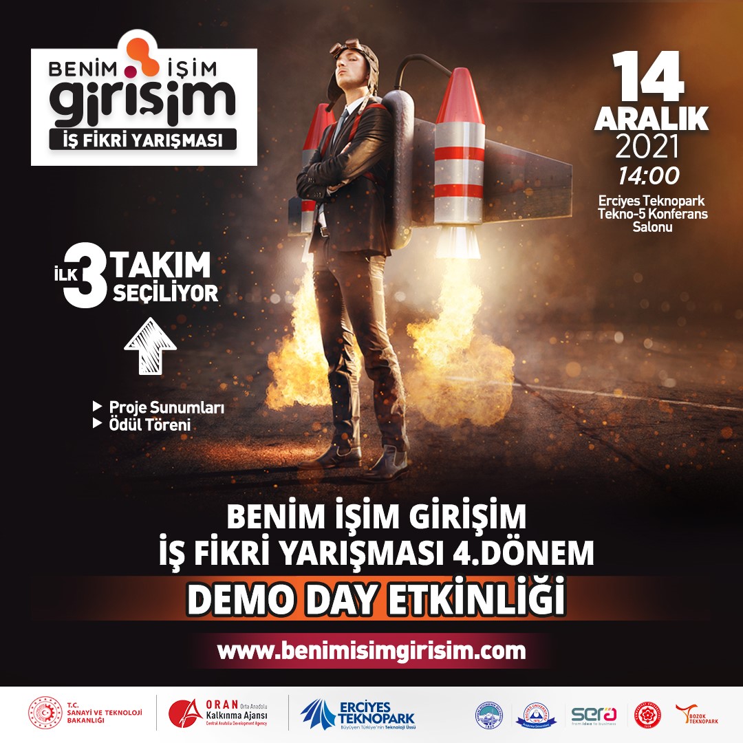 Erciyes Teknopark ve Orta Anadolu Kalkınma Ajansı (ORAN) işbirliğiyle düzenlenen, “Benim İşim Girişim” yarışmasında sona gelindi. Benim İşim Girişim İş Fikri Yarışması IV. Dönem Demo Day etkinliğinde jüri değerlendirmesi sonrasında en iyi üç takım seçiliyor. Ödül töreni sonrasında finalde geliştirilen projeleri inceleyip yerinde görme fırsatı yakalayabilirsiniz.