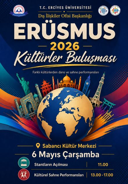 ERÜSMUS 2026 Kültürler Buluşması Düzenleyen : Erciyes Üniversitesi Dış İlişkiler Ofisi Başkanlığı Adres : Sabancı Kültür Sitesi Başlama Tarihi : 06 Mayıs 2026 Çarşamba 11:00 Bitiş Tarihi : 06 Mayıs 2026 Çarşamba 17:00