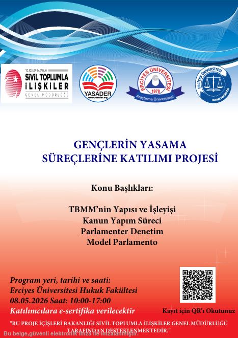 Gençlerin Yasama Süreçlerine Katılımı Projesi Düzenleyen : Hukuk Fakültesi ve YASADER Adres : Hukuk Fakültesi Başlama Tarihi : 08 Mayıs 2026 Cuma 10:00 Bitiş Tarihi : 08 Mayıs 2026 Cuma 17:00