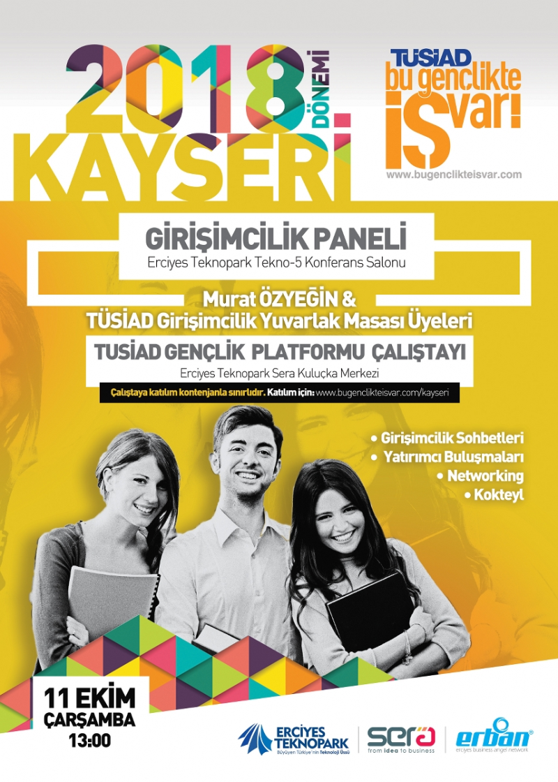 Erciyes Üniversitesi ve Erciyes Teknopark[TIRNAK]ın ev sahipliğinde gerçekleşecek olan etkinlikte Murat ÖZYEĞİN, TÜSİAD Girişimcilik Yuvarlak Masası Üyeleri ve İş Adamlarının katılımı ile girişimcilik üzerine bir panel gerçekleştirilecektir. Aynı zamanda düzenlenecek kokteyl ile TÜSİAD ekibi ve iş adamlarının öğrencilerle buluşması amaçlanmaktadır.